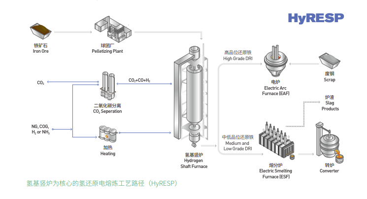 This is a "zero-carbon pathway" towards the future. It utilizes hydrogen to directly reduce iron ore in a shaft furnace, coupled with electric furnace smelting, fundamentally moving away from traditional coke-based metallurgy from the source.